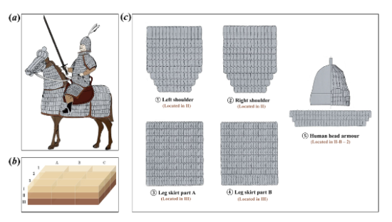 本研究對象是目前世界上已知最早的可復(fù)原甲騎具裝實物—出土于遼寧北票喇嘛洞墓地的珍貴遺存。研究結(jié)果表明,這套甲胄從結(jié)構(gòu)設(shè)計到材質(zhì)加工均體現(xiàn)出高度的技術(shù)成熟度,證明鮮卑在公元4至5世紀(jì)已具備先進的甲胄制造能力;而古蛋白質(zhì)組學(xué)分析首次證實,甲胄制作中使用了羊源材料——這一發(fā)現(xiàn)填補了古代游牧民族甲胄材質(zhì)研究的空白,為探討當(dāng)時草原地區(qū)的動物資源利用、畜牧業(yè)發(fā)展與軍事手工業(yè)的關(guān)聯(lián)提供了直接證據(jù)。