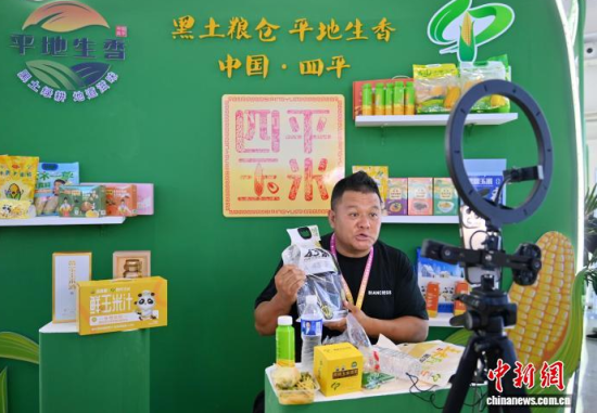 8月15日,吉林長(zhǎng)春,商家在農(nóng)博園內(nèi)直播售買玉米。當(dāng)天,第二十四屆中國(guó)長(zhǎng)春國(guó)際農(nóng)業(yè)·食品博覽(交易)會(huì)在長(zhǎng)春開(kāi)幕。本屆農(nóng)博會(huì)集中展示中國(guó)最前沿的農(nóng)業(yè)科技成果,彰顯“大國(guó)糧倉(cāng)”的科技實(shí)力,吸引眾多參觀者近距離體驗(yàn)現(xiàn)代種植技術(shù)及優(yōu)質(zhì)農(nóng)產(chǎn)品。中新社記者 張瑤 攝