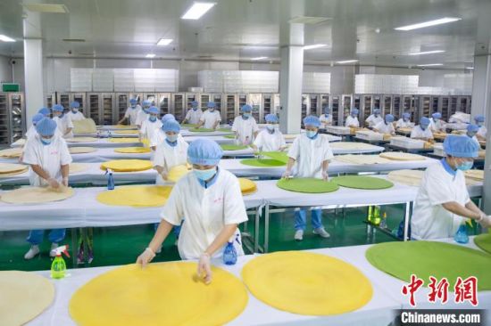 工人正在煎餅車間里工作!《鼗形麄鞑抗﹫D